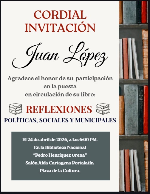 Santo Domingo, R.D  El sociólogo y profesor universitario Juan López  pondrá  en circulación su libro “Reflexiones políticas, sociales y municipales”,  un compendio  de temas  donde  reflexiona  sobre   política   y  el  funcionamiento  de los  gobiernos  locales  el país.